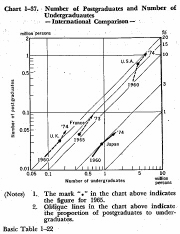 The relationship of the number of postgraduates to that of undergraduates in several selected countries is shown in Chart 1-37. The number of postgraduates in the U.S. is preeminently large, while in Japan it is about the same as that of the United Kingdom. For France, the enrollment in the troisieme cycle (third course) of universities (research courses after finishing the four-year undergraduate courses) is taken as an object of comparison. It is larger than that of Japan or the United Kingdom.