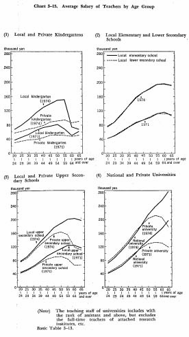 As regards the average salary in 1974, it is notable that the average salary level of private kindergarten teaclters is exceedingly low, that the gap in average salary between local upper secondary school teachers and private upper secondary school teachers widens as the age advances, and that the average salary for private university teachers is kept higher than that of national university teachers till their age reaches the mid-forties, but is surpassed by the latter thereafter. For precise comparison, however, the gap in years of searvice has to be taken into account.