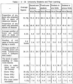 The average number of students' working hours outside the classroom (e.g., at libraries and at home) is 8.2 per week for all students. The average number of these hours is 6.3 for male students studying in the humanities and social science fields, (and 8.3 for female students in the same fields, 9.2 for male students in science fields, and 9.3 for female students in the same fields). The average number of volumes of books read by students during one month is 2.6. (Books include those for scientific, technical and professional knowledge and for general culture, and exclude comics. Magazines, textbooks and supplementary textbooks.)