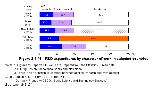 Classification into basic research,applied re-search and development 8) ,may differ from country to country.Although it is difficult to make a comparison due to differences in distinctions between the three among the countries concerned,R&D expenditure data by character of work generally reflects the R&D activity of each country.Recent statistical data for Japan,the United States,Germany and France shows that France and Ger-many spend more on basic research and that Japan spends less on basic research (Figure2-1-16) .