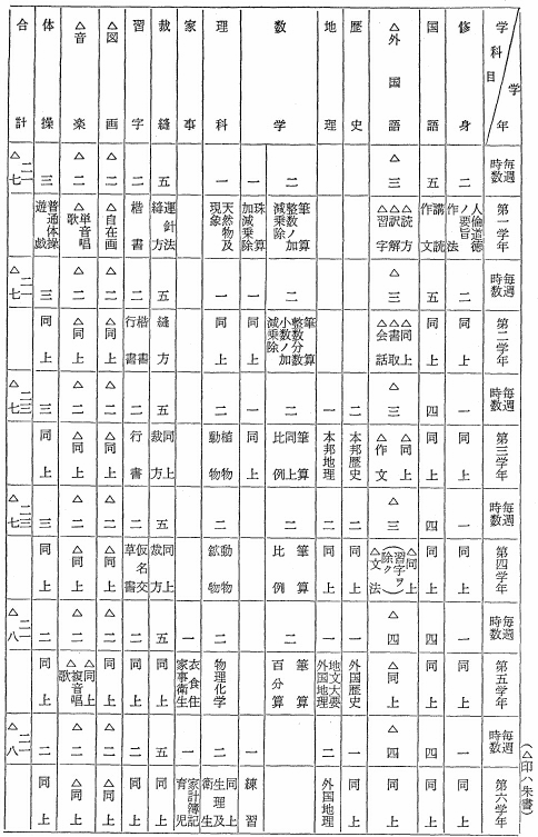 一 必修科ノ学科課程ニ関シ其標準ヲ示スコト左表ノ如シ但シ毎週教授時数ヲ第五条ノ制限数ニ満タシメサルハ随意科目ヲ加フルノ余地ヲ存セントスルニ依ル