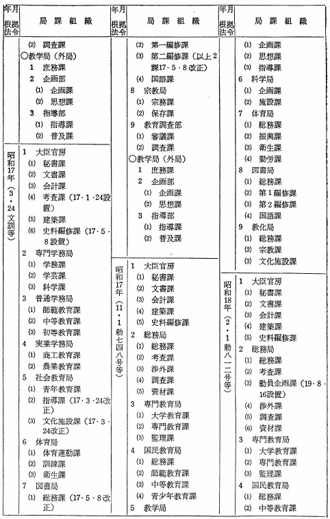 2 督学官、視学官等の局部課組織そのものでない官職については、技術的理由から、昭和20年以降の局次長および昭和27年文部省組織令制定以降の政令以上の官を記載し、他は割愛した。