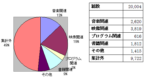 収集された情報より、ランダムに約20,000件を抽出し、抽出データに含まれるファイル名を確認の上、各ファイルに推定されるジャンルと権利の対象及び許諾の有無について調査しました。