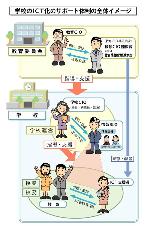 「IT新改革戦略」において、学校のICT化のサポート体制強化の必要性が提言され、平成20年3月には、学校のICT化のサポート体制の在り方に関する検討会が「学校のICT化のサポート体制の在り方について~教育の情報化の計画的かつ組織的な推進のために~」をまとめている。ここでは、報告書の趣旨に沿って、教育委員会が地域や学校における教育の情報化を計画的、かつ組織的に進めるための役割について述べる。