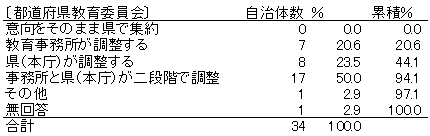 また、市町村教委の意向を都道府県(本庁)が集約するだけで異動案を作成するという回答はみられず、2-1と同様、都道府県教委や教育事務所が調整機能を発揮することで人事行政が進められているという傾向が示された。これは、市町村教委の意向をそのまま集約するだけでは人事が成立しないという状況を示していると言い換えることもできる。