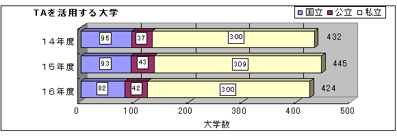 注)北野(2006年)による(平成14~16年に24大学を対象としたインタビュー調査の結果)。なお、苅谷(1992年)は、TA導入に関して、「研究の時間を割いてまで、大学院生に教育経験を与えようというのであれば、その経験が生きるための制度的な支え、組織的な訓練の場というものを合わせて導入する必要」、「講座の主任教授との関係が大学院生の就職機会を左右しやすい日本の大学院では、TA制度のナイーヴな導入は、運用次第ではTAを「大学における知的皿洗い」におとしめる危険性をもっている」と指摘。