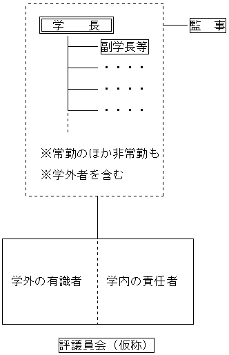 | (B案) | 教学面に責任を負う評議会と並んで、経営面に関する重要事項を審議するための機関を設け、そこに相当程度の学外の有識者を参画させる案 | ||