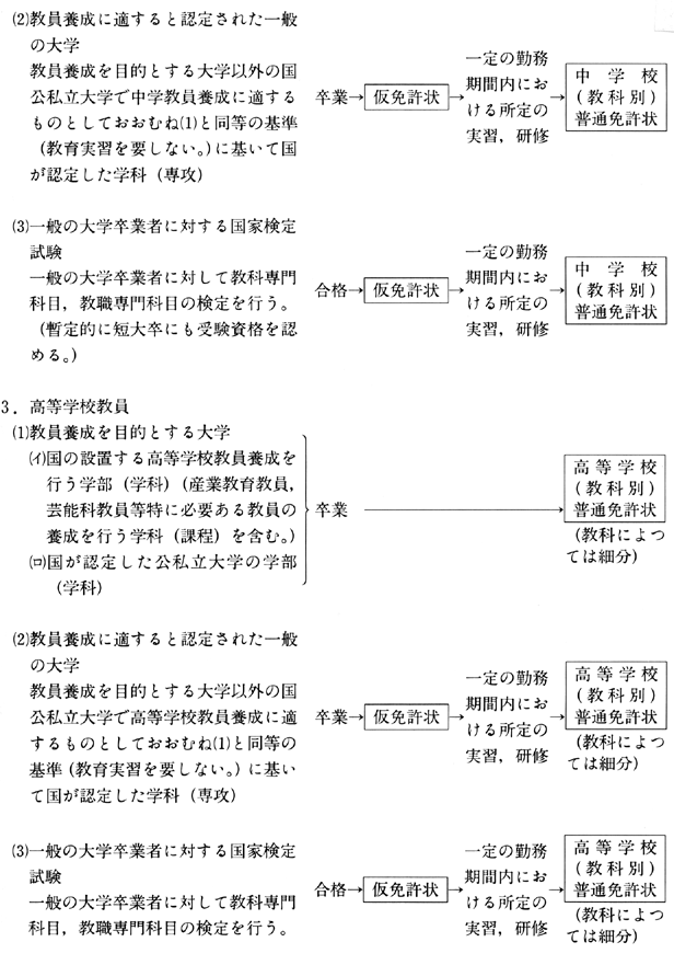 (ロ) 一般の大学の認定された学科(専攻)において所定の単位を取得した卒業者および国家検定試験合格者には条件付の教員資格を与え,仮採用後,一定の勤務期間,所定の実習,研修を終了した後,正規の教員資格を与える。この実習,研修は国がその基準を定め,任命権者の責任の下に一定の計画をもつて行うものとする。この場合,任命権者はその指導組織を整備し,かつ実習,研修のため児童生徒の教育に支障を生じないよう配慮するものとし,教育大学等は任命権者と協力してその研修課程において実習,研修に当るものとする。