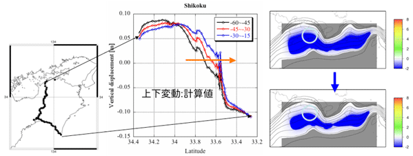 三陸沖プレートにおける余効滑り・余震域拡大の数値シミュレーションにより、余効滑りや余震域の拡大速度は定常的摩擦の速度依存性を支配するパラメータ(A-B)に依存することを明らかにした。また、前述したように、南海トラフ沿い巨大地震発生サイクルのシミュレーションを行い、固着の剥がれに伴って隆起域と沈降域の境界が15年間で数キロメートル程度移動することを示した。