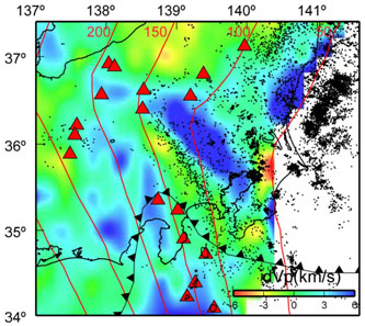 | 図3.関東における上面の地震活動とスラブ直上のP波速度偏差(Hasegawa et al.,2007)。赤線は上面の地震の等深線を、赤三角は活火山を表す。 |