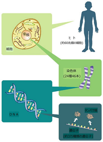 | 人間の細胞には、核と呼ばれる部分があり、その中の24種類の染色体に”遺伝情報”が蓄えられています。 |