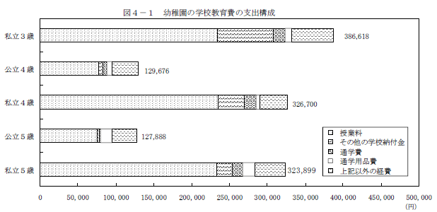中学校では私立より公立が高く,幼稚園,高等学校では公立より私立が高くなっており,公立学校については,幼稚園4歳児から中学校第3学年まで,学年が進むにつれて高くなっている。なお,公私立を問わず最も高いのは,公立中学校第3学年の25万円(同8.1パーセント)となっている。 |