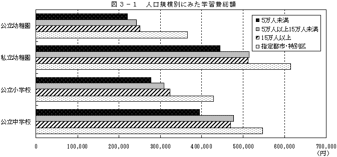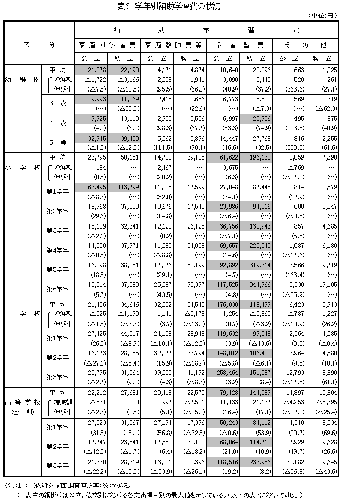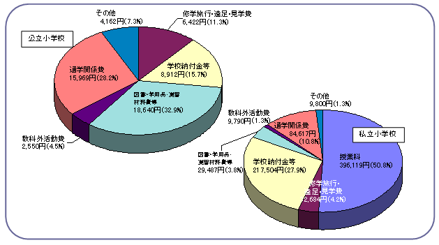 幼稚園は公立25万1千円(対前回調査伸び率5.5パーセント),私立53万8千円(同5.7パーセント),小学校は公立33万4千円(同6.4パーセント),私立137万3千円(前回未調査),中学校は公立47万2千円(同0.6パーセント),私立126万9千円(同