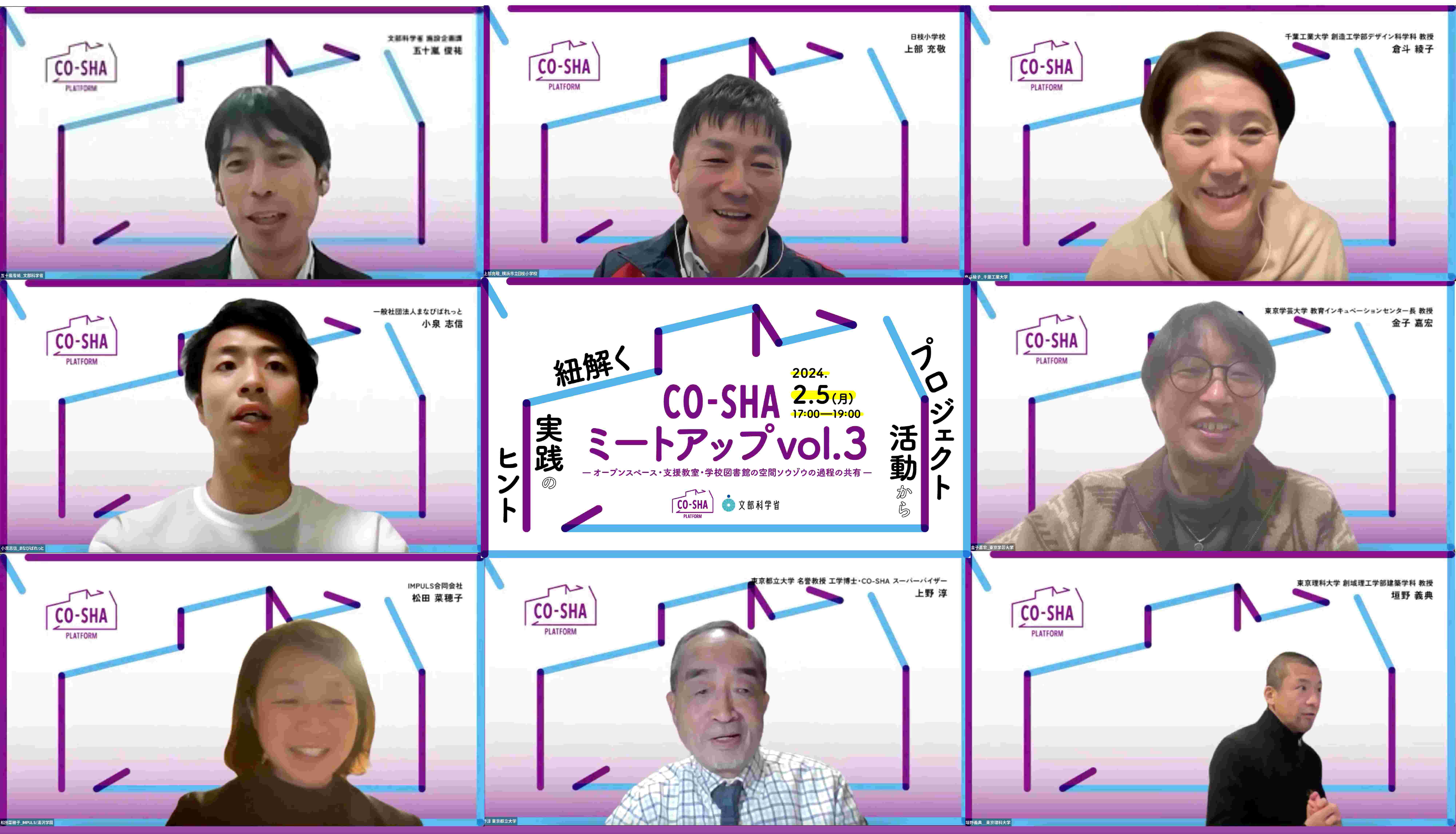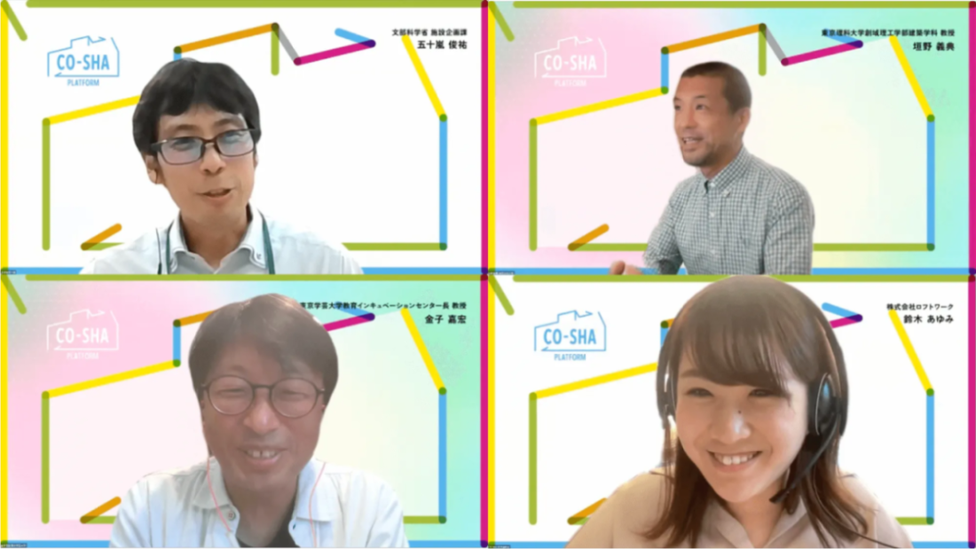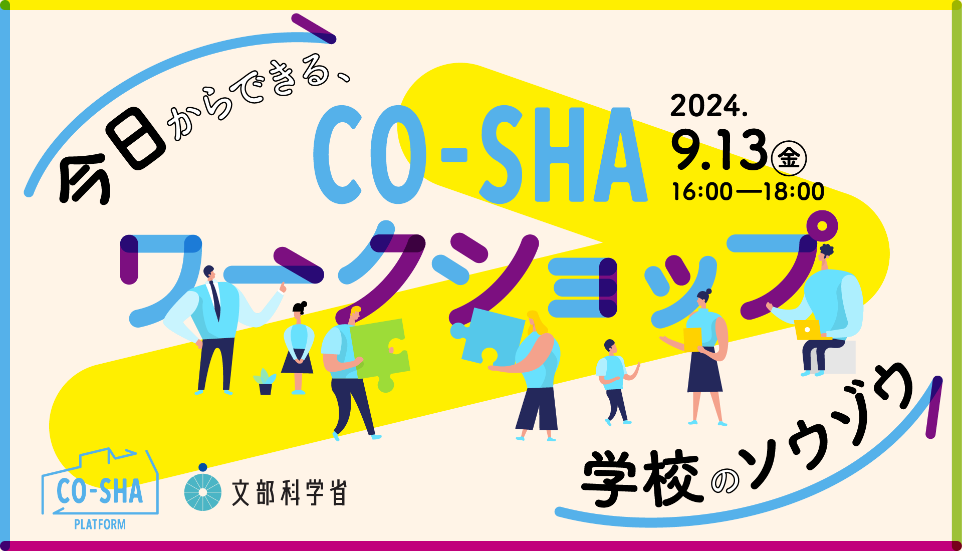 「CO-SHA Platform(コーシャプラットフォーム)」は、新しい時代の学びを実現する学校施設づくりを支援するプラットフォームです。主に小中学校の学校設置者や教職員のみなさんに向け、学校施設の整備や活用を進めるための、オンライン/オフラインでの共創・共有の場づくりを目指します。