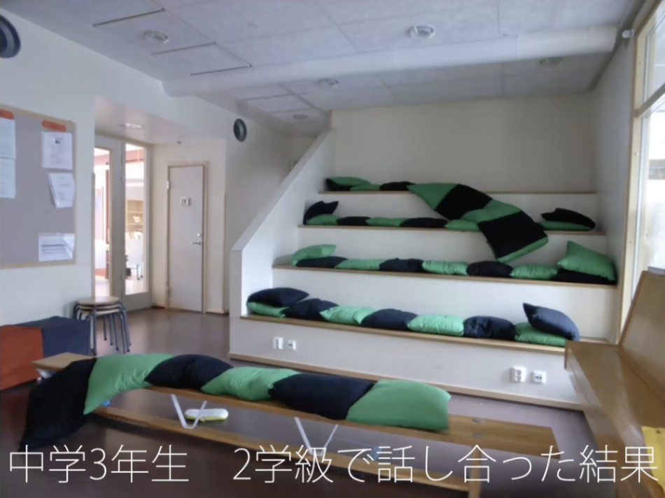 また、「学校建築を学習教材のひとつとして捉えれば、空間の利用リテラシーを高めることもできます。こちらはスウェーデンの事例で、中学3年生の子どもたちによる話し合いの結果、家庭科で作ったクッションを置いて、自治の場を作った例です」(垣野先生)。