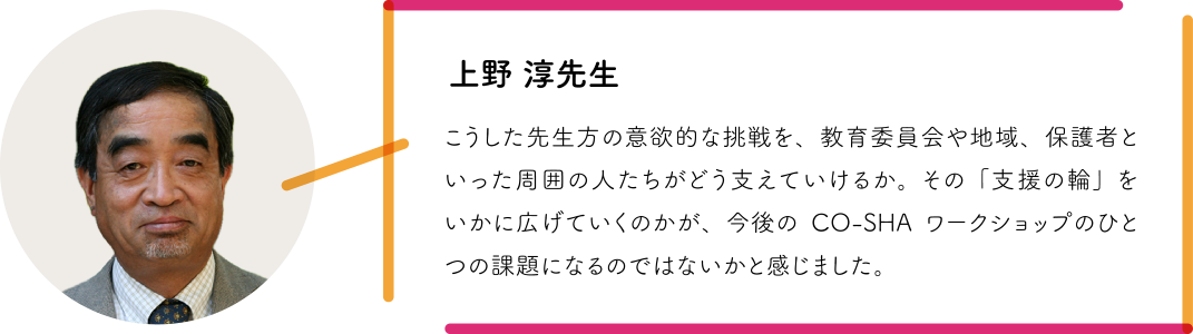 東京都立大学名誉教授 上野先生(以下、上野先生):ここまでの取り組みはとても素晴らしいですし、遠藤先生がほんとうに素晴らしい先生だと思いますので、教育委員会やPTAも含め全校を上げて、遠藤先生をバックアップする仕組みをしっかりと整えてもらいたい。この取り組みが事例として全国へ広がることを期待しています。