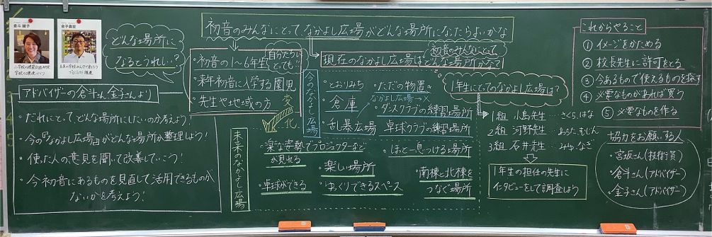 ワークショップの翌週、初音が丘小学校の遠藤先生は、早速ワークショップでのやり取りを踏まえ、子供たちと「なかよし広場」の環境づくりに取り掛かりました。授業の前半は、教室でなかよし広場をどのような空間にしていきたいか、子供たちと話し合いました。ひとの行動、もの、空間の3つの項目で整理し、自分たちが目指したい「なかよし広場」のイメージを膨らませました。