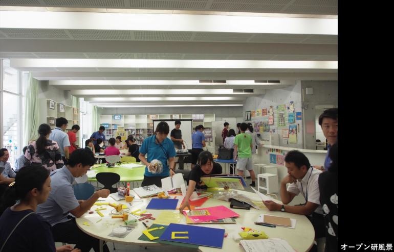 また、この美浜打瀬小学校では、2012~2013年度および2016年度に「オープンプラン小学校の学習環境づくり(略称:オープンスクール研究会)」という取り組みを行いました。これは、美浜打瀬小学校の教職員と、学校建築や音環境、教育の研究者や建築を専攻する大学生が協働して、学校空間の特性を活かした学習環境づくりを研究・実践したものです。