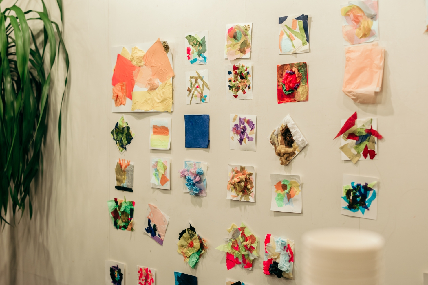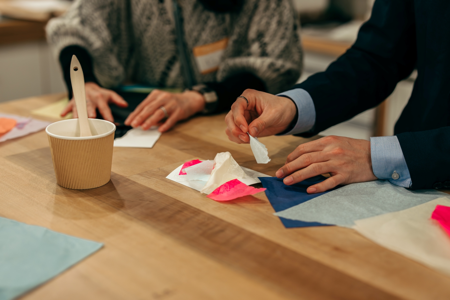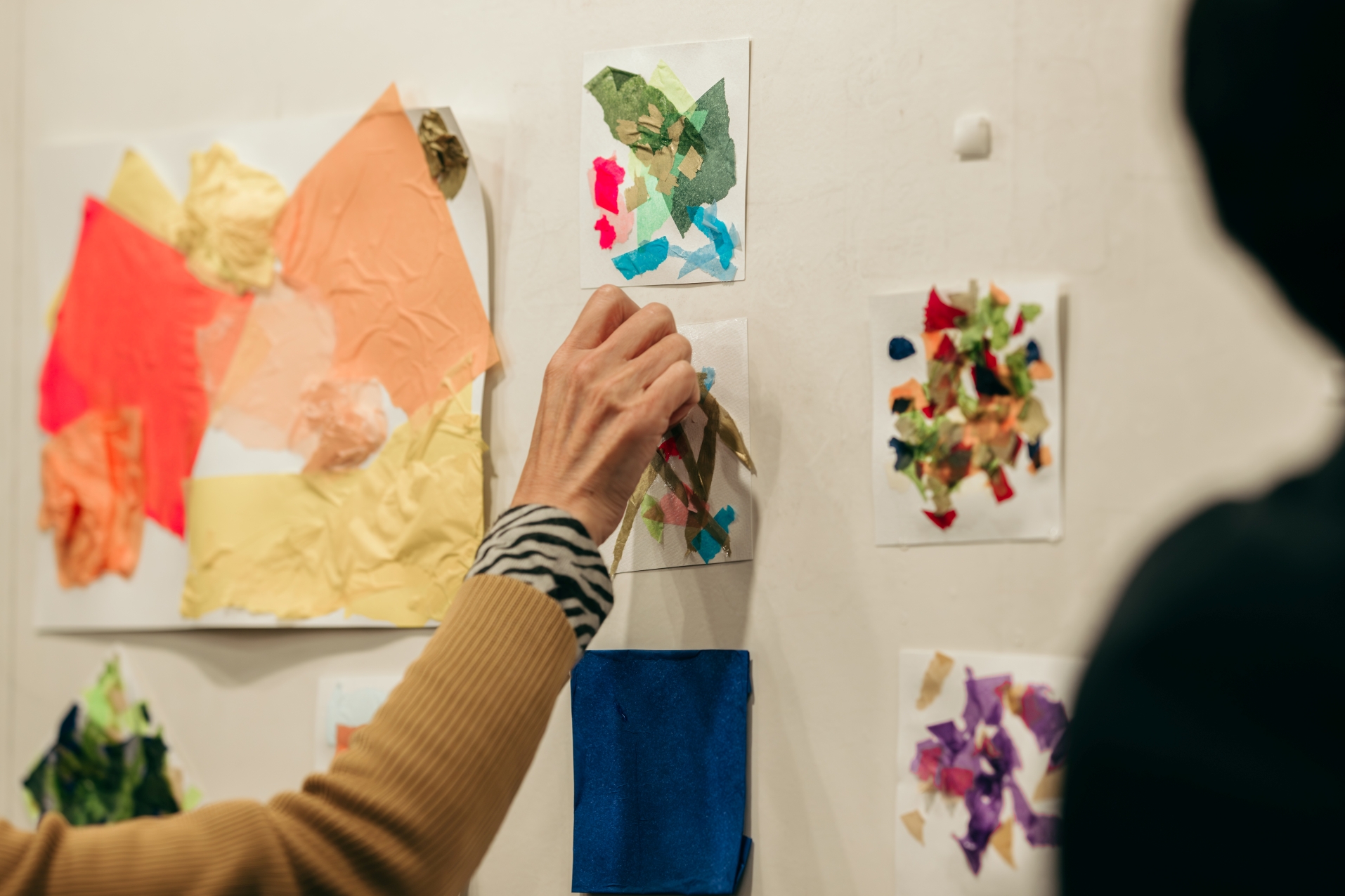 ここからは会場の参加者のみなさんで、山内さんの造形対話のワークショップを行いました。色とりどりの花紙の中から、好きなものをちぎって、台紙に貼っていきます。そしてできたものを見ながら、なぜこの色を使ったのか、どんな思いを込めたのか、などを3人1組で語り合います。