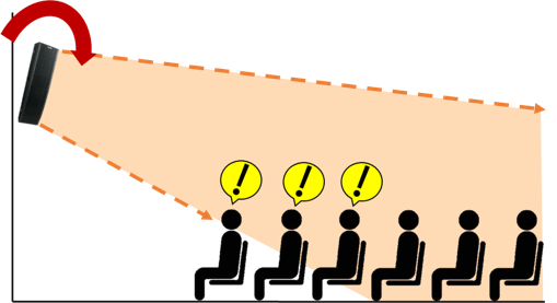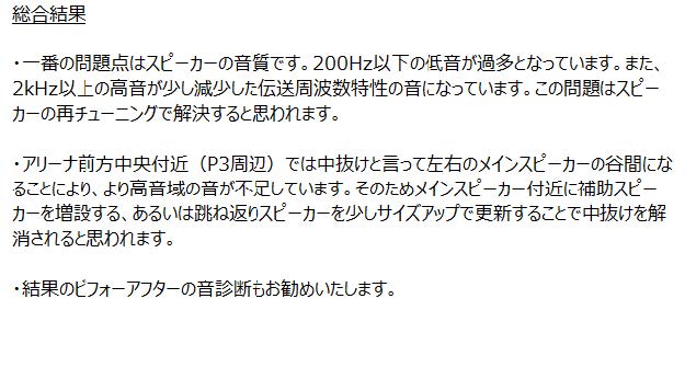 メインスピーカーの音の届き方に偏りがあり、体育館の前方の中央付近で聞こえ方が弱くなる「中抜け」が確認された。中抜けの改善にはスピーカー角度調整が有効であるが、金具取付状態の影響により水平角度の調整が困難であったため、垂直方向の角度を3度下げる調整により前方エリアの聞こえ方を軽減した。