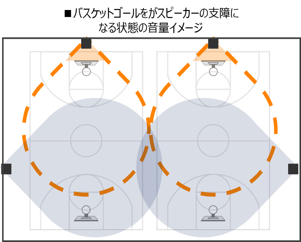 可動式バスケットゴールがメインスピーカー前方に位置することで音を遮蔽し、ステージ前の音が聞き取りづらく、場所によって聞こえ方に大きく差が生じている状況が確認された。音声中心の授業・行事ではゴールを下ろさずに使用する運用を基本としたうえで、アリーナ両側面に当初から設置されていたサブスピーカーを活用し音量バランスを再調整することで、聞こえ方のばらつきの低減を図った。