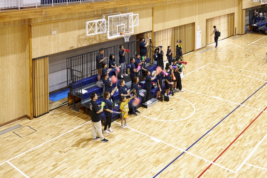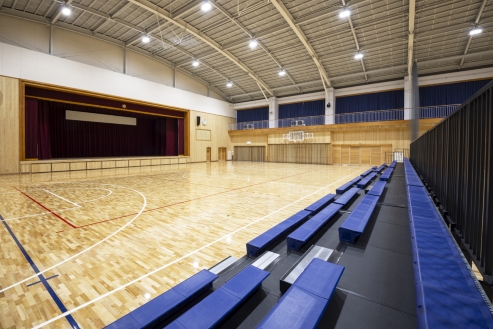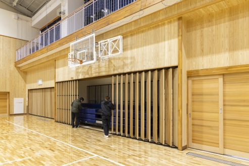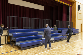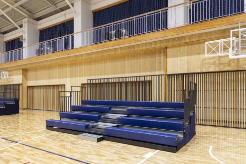 新しい体育館は、体育の授業や部活動の場としての機能だけでなく、試合を観戦できる設備が整っている。このようなフレキシブルな空間利用のために導入されたのが、客席を自由に展開・設置できるユニット型移動観覧席だ。