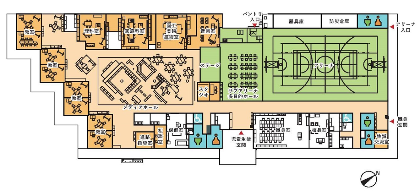 屋建の校舎の中央にホームベースとメディアホールが位置し、その周辺を囲むように教科教室等が配置されている。隣接して整備されたアリーナ、多目的ホール兼ランチルーム及びステージは、その用途に応じて間仕切りを無くし、一体的に使用することも可能となっている。また、昇降式のステージは、普段はフロアレベルに格納されており、限られた空間を有効に活用する工夫が施されている。