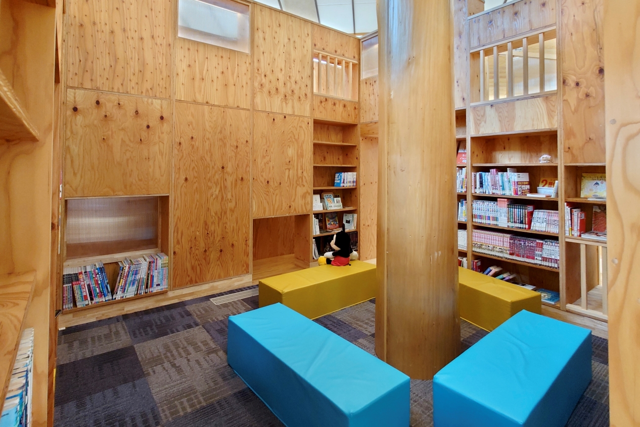 こうした空間に設けられた造り付け家具は、様々な子供たちの居場所となる。ホームベースに接する場所では荷物ロッカーやカウンターの機能を備えるとともに、家具によって生まれる区画を活かした本棚や展示スペース、活動の場を作り出している。
