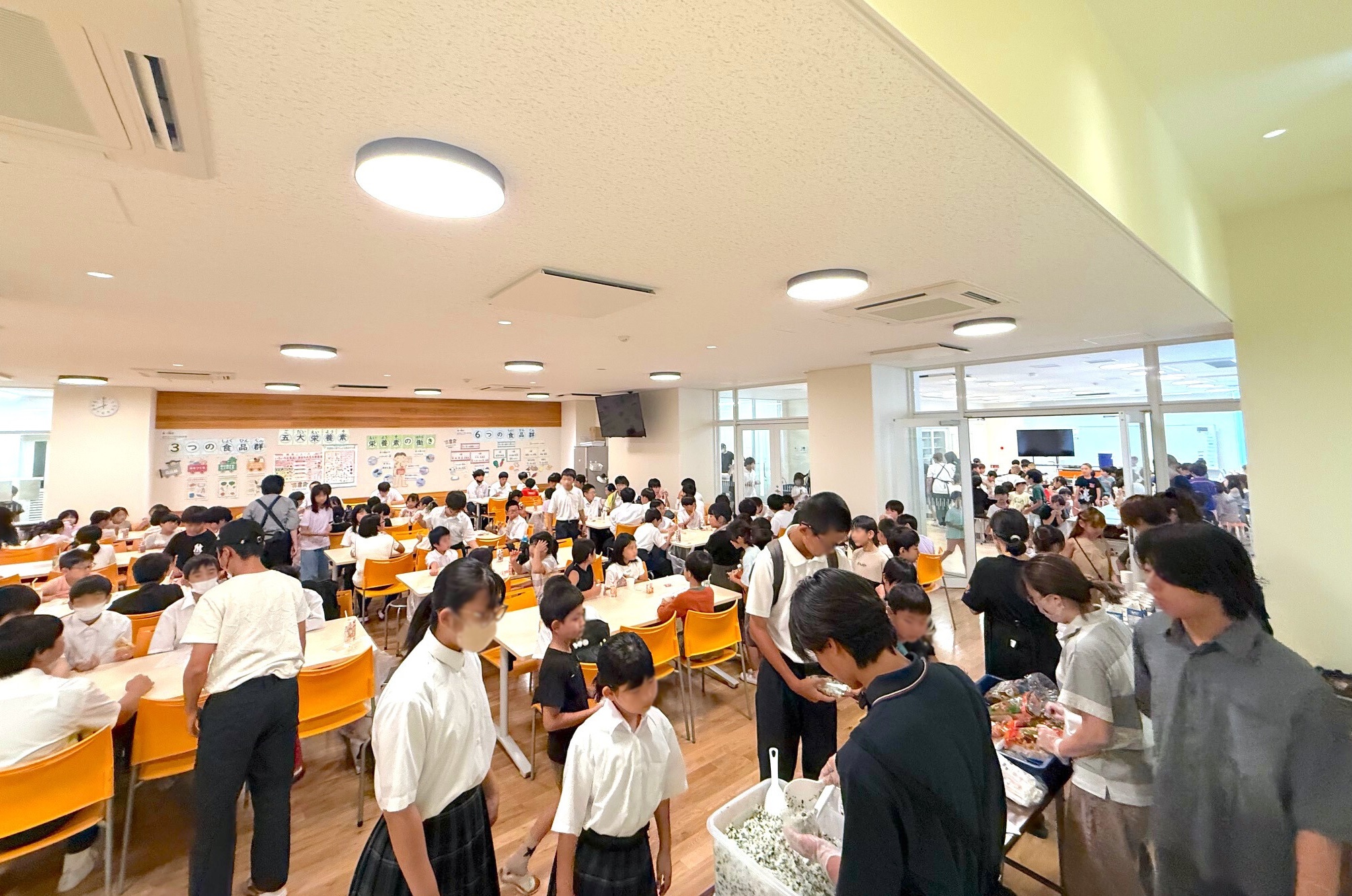 「あいさつロード」に面して大きなエントランスが設けられ、その隣接スペースをどう活用するかについては、計画段階から議論が重ねられた。そこで地域との関わりを見据えて採用されたのが、食育と交流を支えるランチルームの設置である。保護者や地域の人が調理に関わることで、学校と地域が協力して、子どもたちの健やかな食生活を支える仕組みがつくられている。子どもたちは1年生から9年生までが日替わりで異学年と給食を共にする「給食交流」を実施し、学年を越えた関係づくりの場にもなっている。