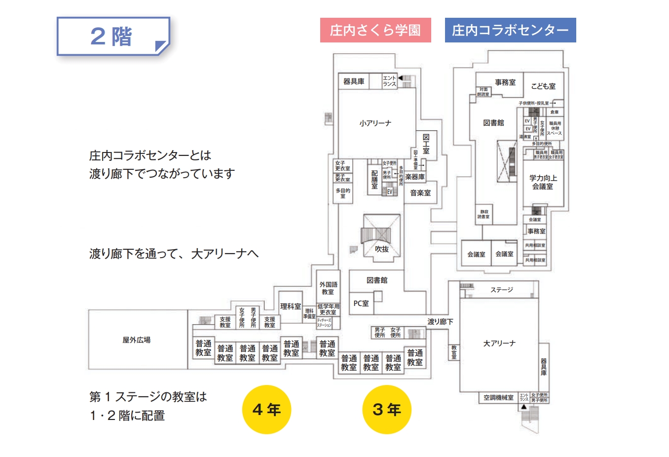 庄内さくら学園では、9年間の学びをつなぐ小中一貫の教育体制として、4-3-2のステージ制が導入されている。1・2年生を第1ステージ、3~5年生を第2ステージ、6~9年生を第3ステージとし、それぞれの発達段階に応じた教育が行われている。学年の配置もこのステージ制に対応して、1~2年生は1階、3~4年生は2階、5~7年生は3階、8~9年生は4階に各教室が配置されている。各階にはクラスや学年を越えて学び合えるオープンスペースが設けられており、発表や交流の場として活用されている。