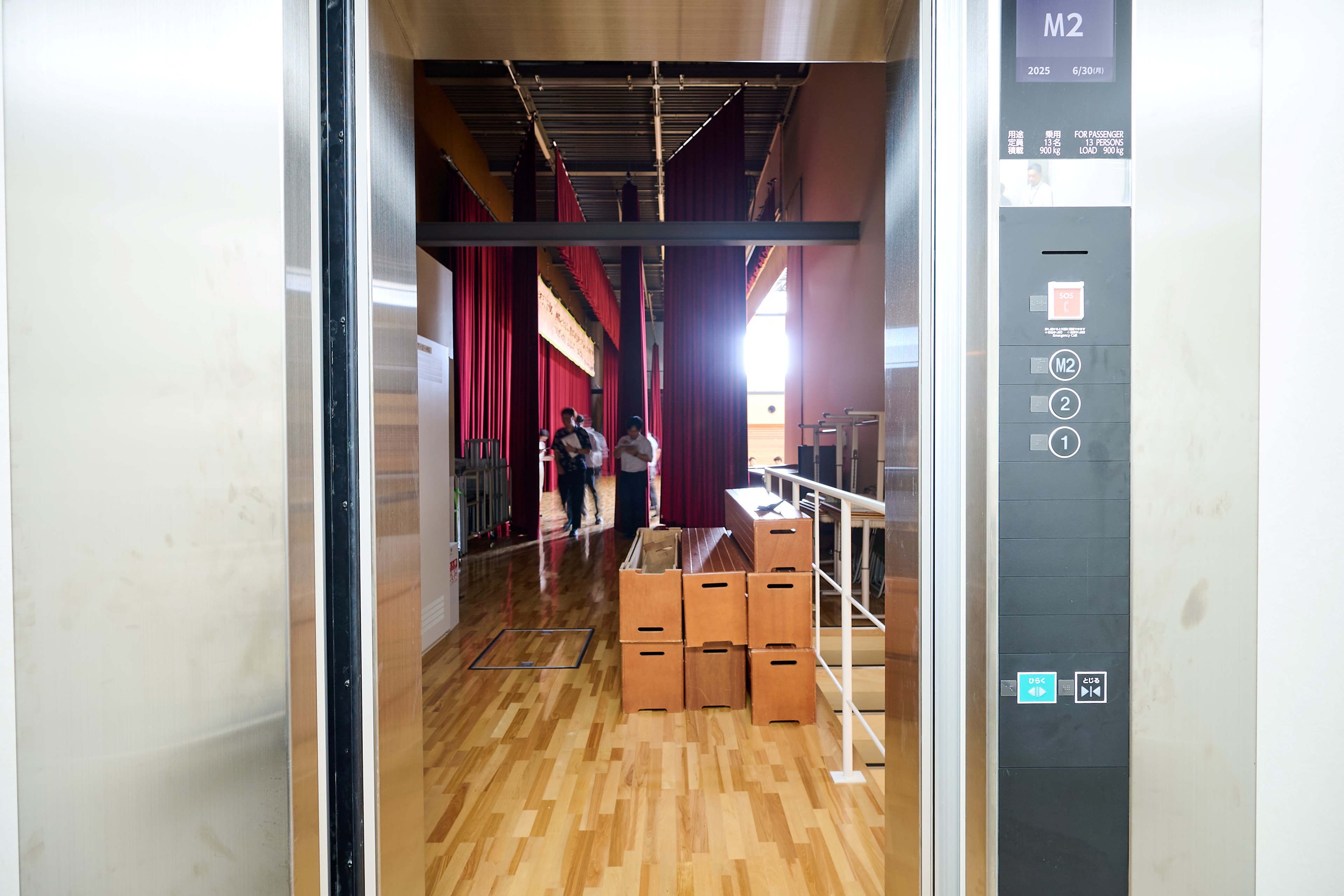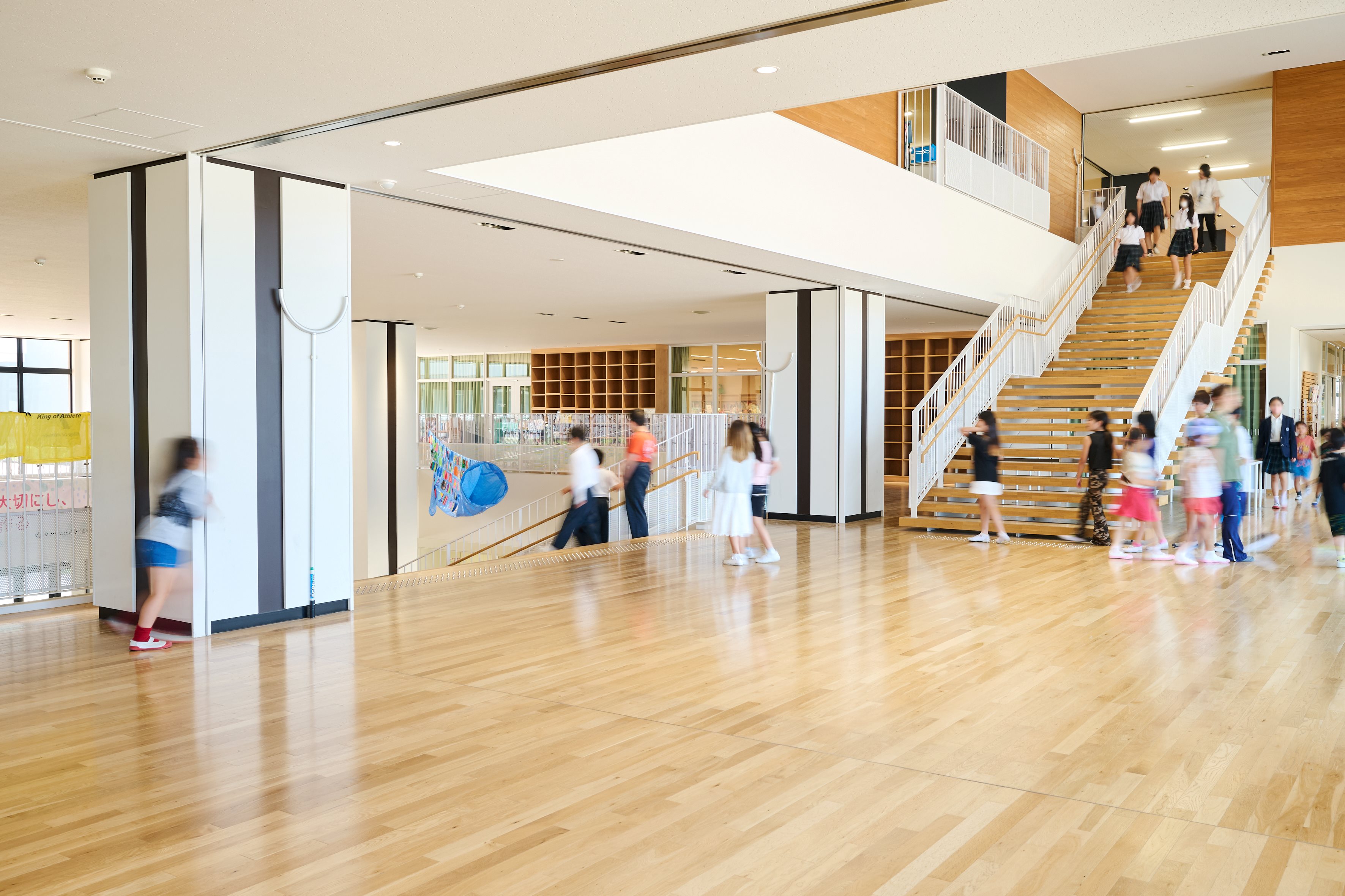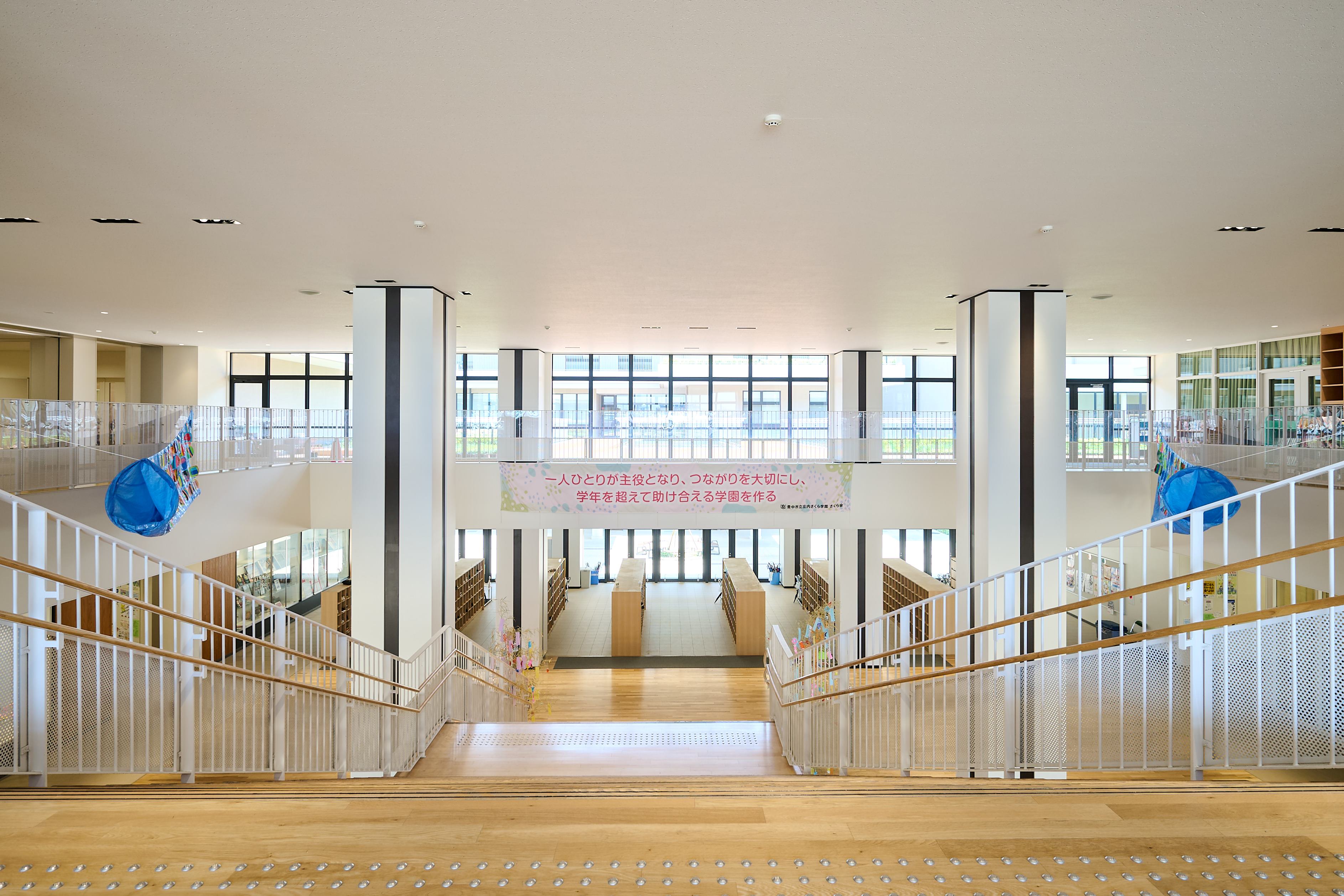 大階段の先には、3階へと続く2つの吹き抜け空間が連続して広がり、開放的な空間構成となっている。吹き抜けがあることで、閉塞感を感じさせず、校舎全体がひとつにつながるような一体感と広がりが生まれている。この空間は、子どもたちが日々の授業で発表などを行う表現の場として使われているほか、地域の人々を招いたイベントや学年を超えた交流の場としての活用も想定されており、学年や立場を超えて人が集い、つながりを育む場となっている。