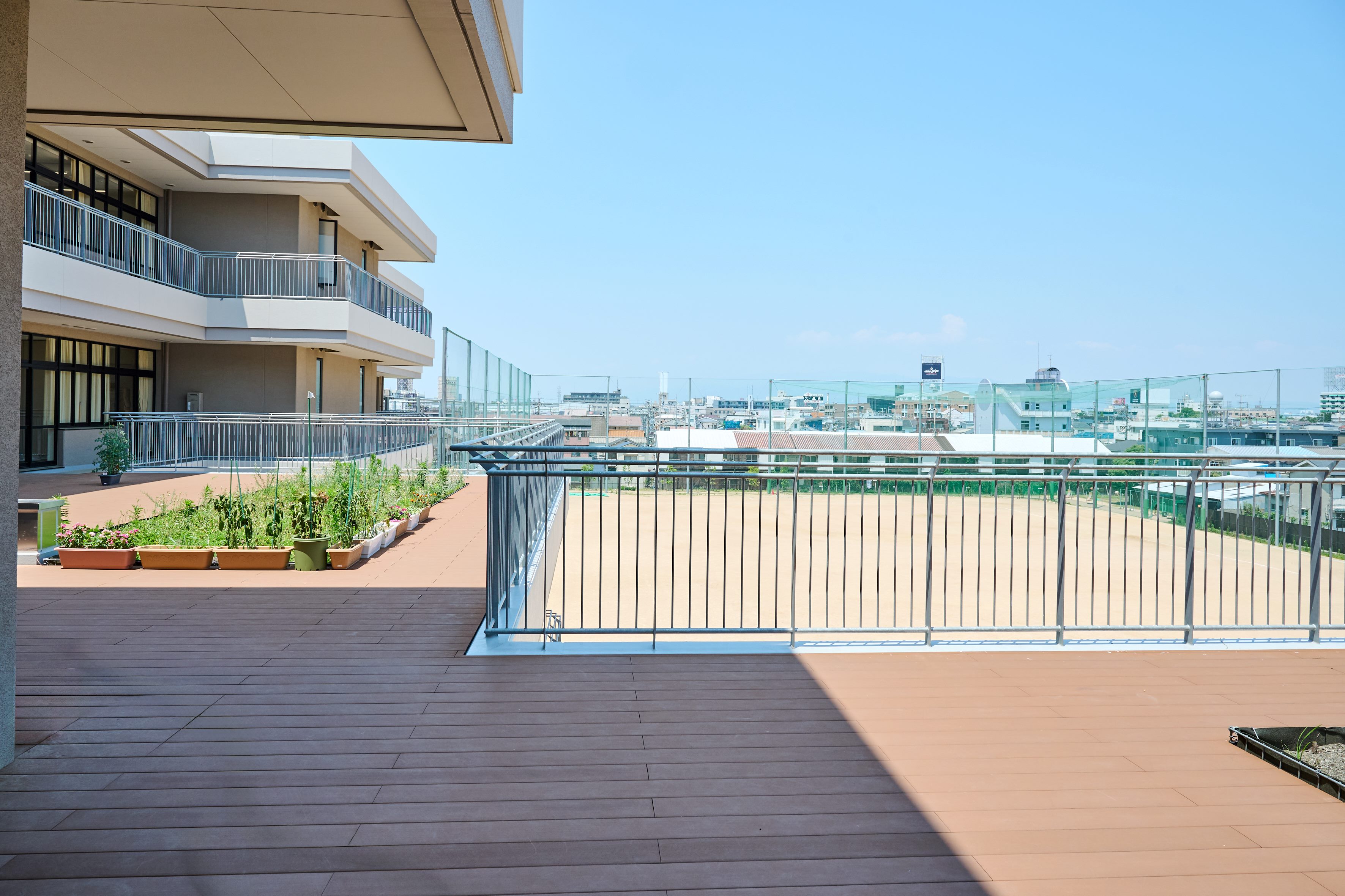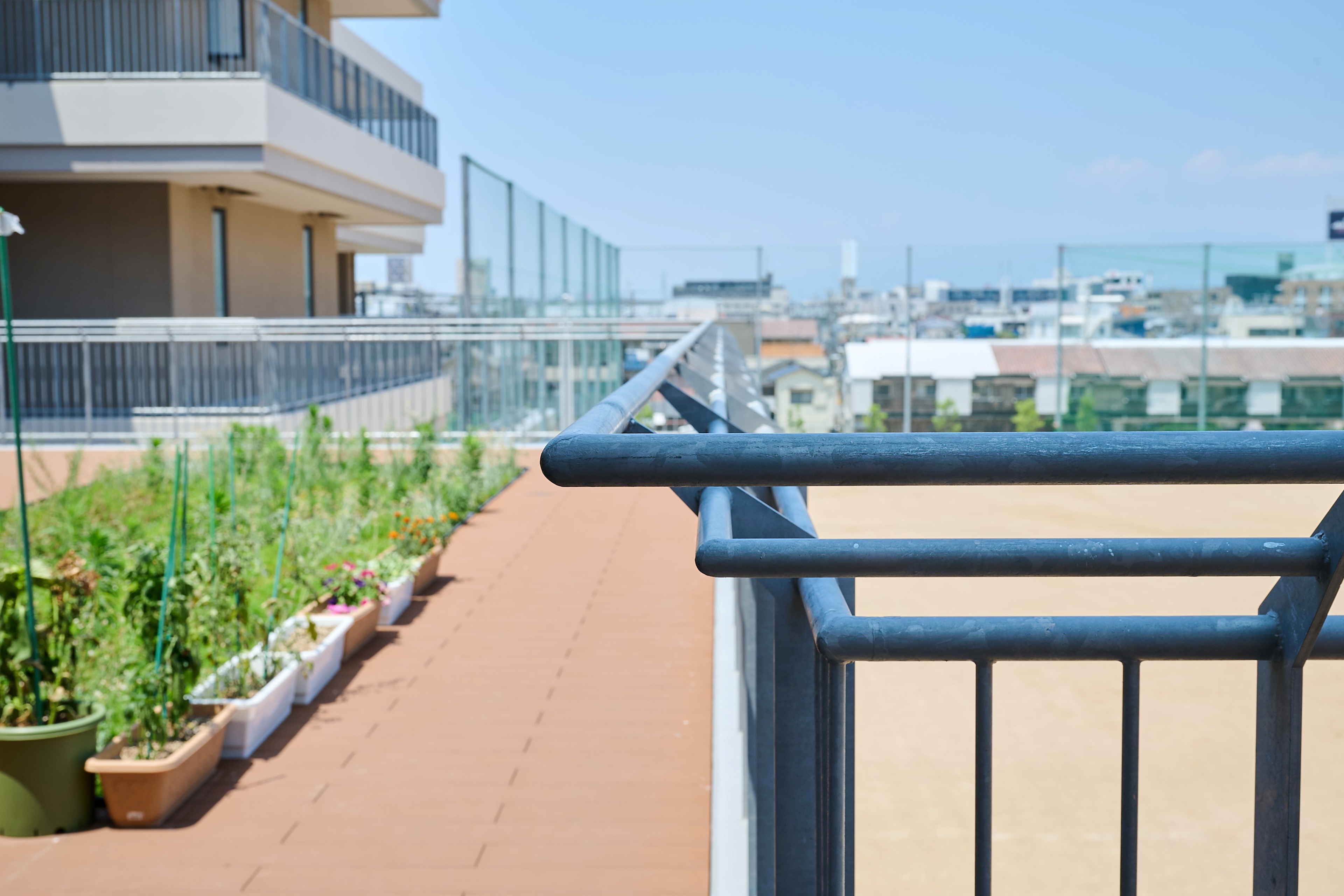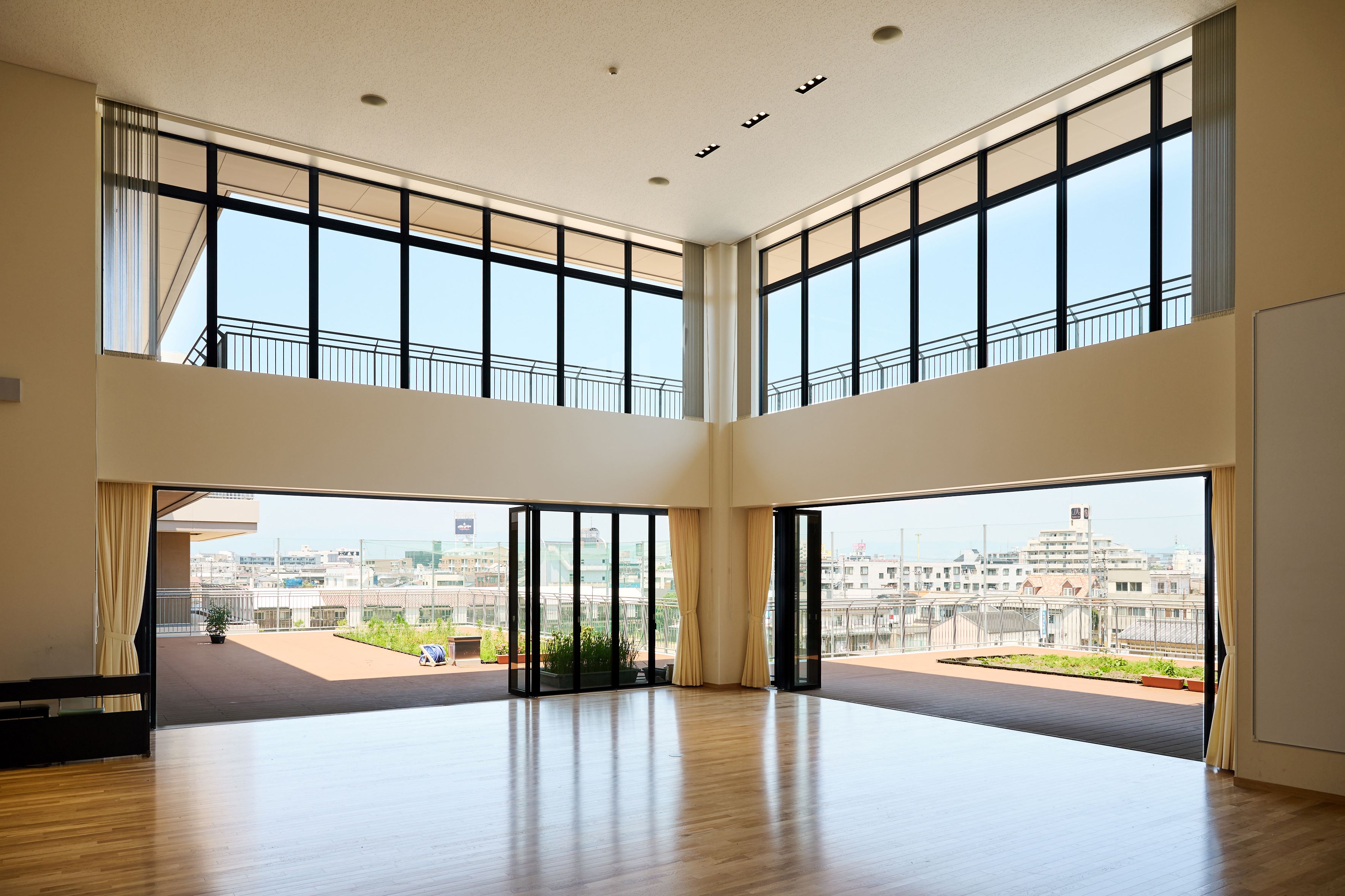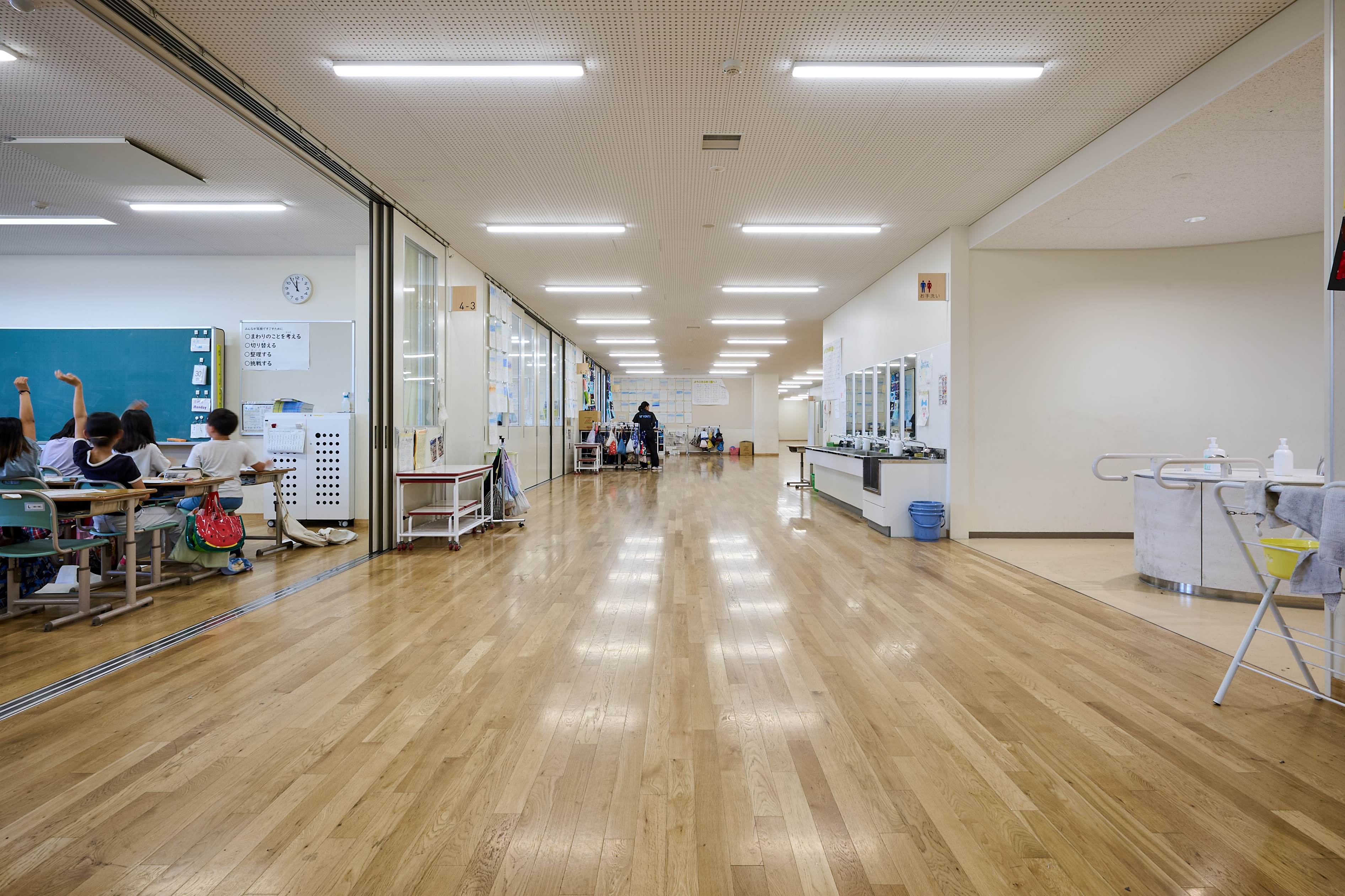 校舎を一周する幅の広いバルコニーは非常時には避難通路として機能し、速やかに外部へと移動できるよう設計上の工夫がなされているほか、運動会などの行事における保護者や観客の観覧席としても活用することで、限られた敷地の運動場を有効に使うことができる。折戸を開放することで、オープンスペースが屋外バルコニーとつながり、自然を身近に感じられる開放的な空間が広がる。