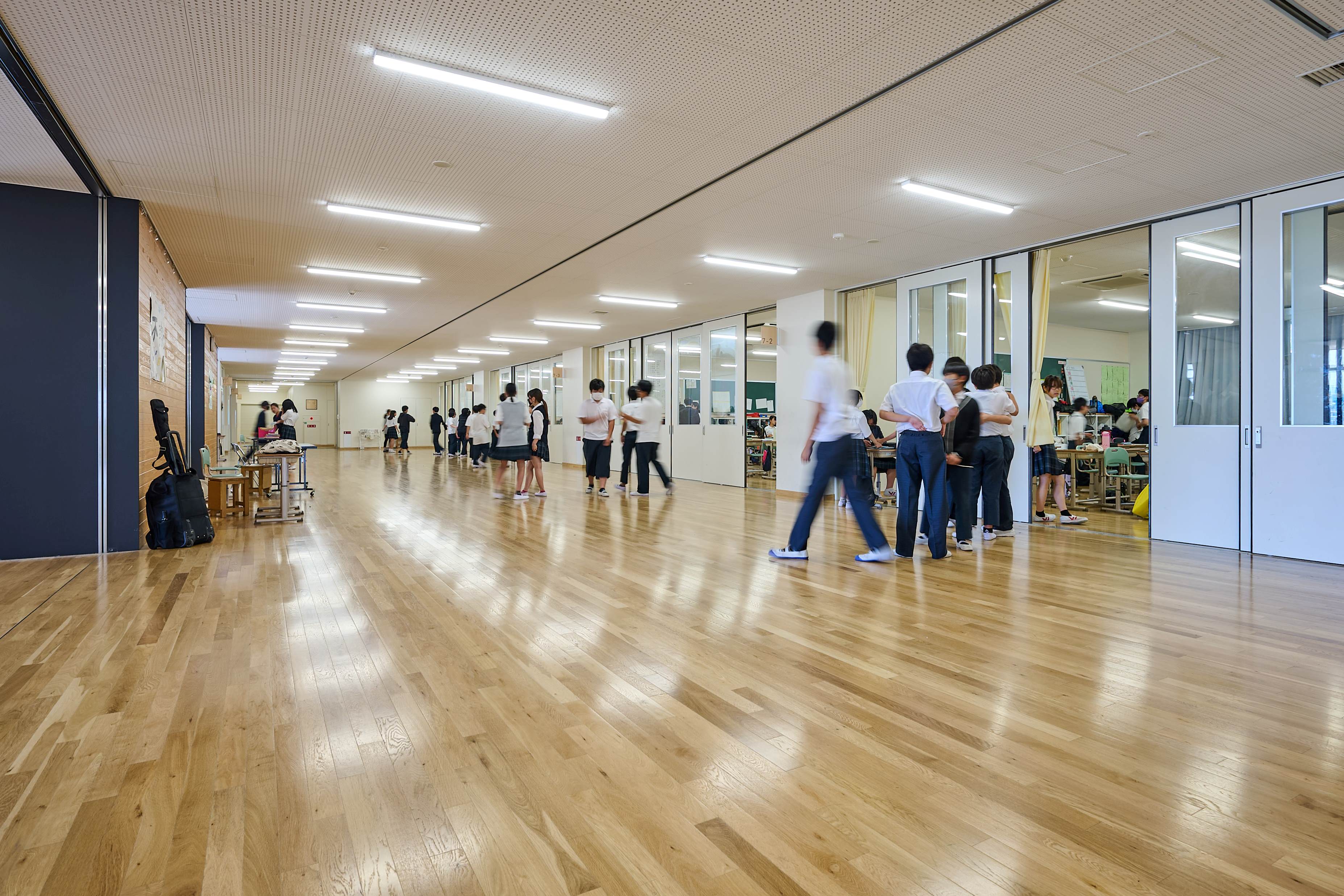 こうした教育面のソフトと空間のハードが連動した設計により、学習活動が途切れることなく9年間継続し、教職員による見守りや連携も継続されることで、安心感のある教育環境が整えられている。また、3年生から始まる英語教育や、5年生からの制服着用など、中学校への移行を段階的に行う仕組みも備えており、「中1ギャップ」の軽減や不登校の予防にもつながっている。