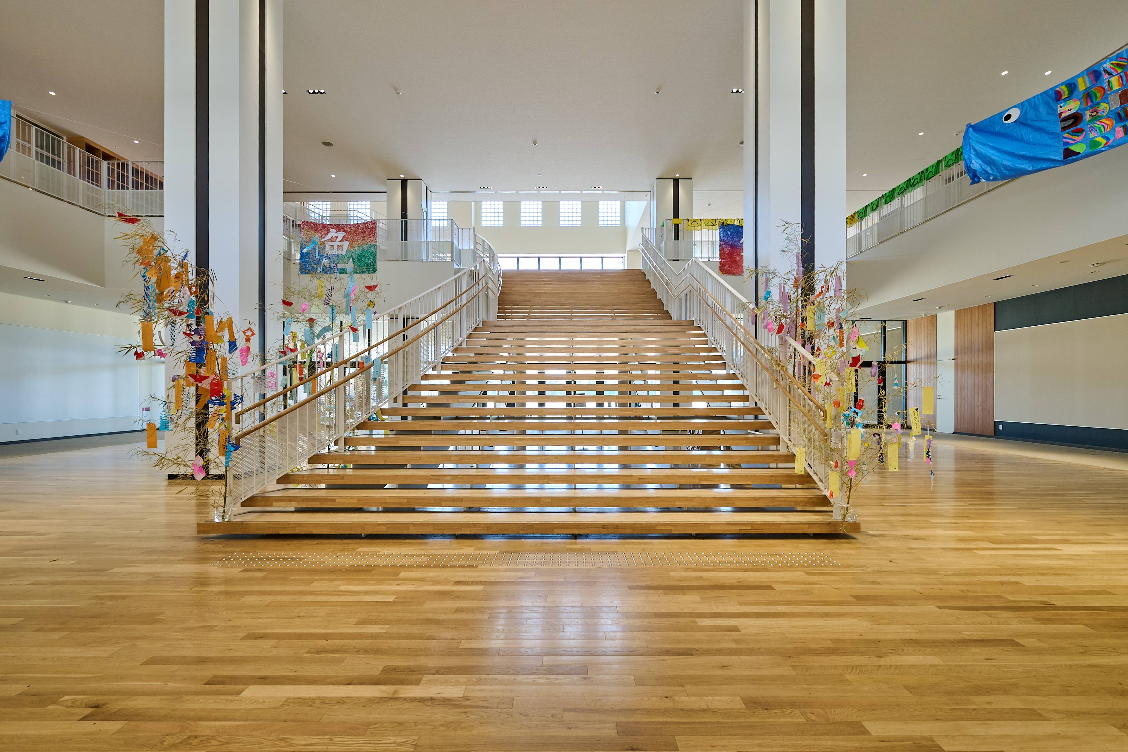 子どもたちが日常的に通行する動線であると同時に、入学式等での記念撮影のひな壇としても活用されている。また、子どもたちの作品展示や発表会の会場としても多目的に使うことができるスペースとなっている。「あいさつロード」からも様子が伺えることで、前を通る保護者や地域の人々も子どもたちの活動を垣間見ることができる。子どもたちの主体的な表現や活動、日々の生き生きとした姿が学校の中心に集まり、外部にも自然と伝わっていくことで、学校全体に活力をもたらす象徴的な場となっている。