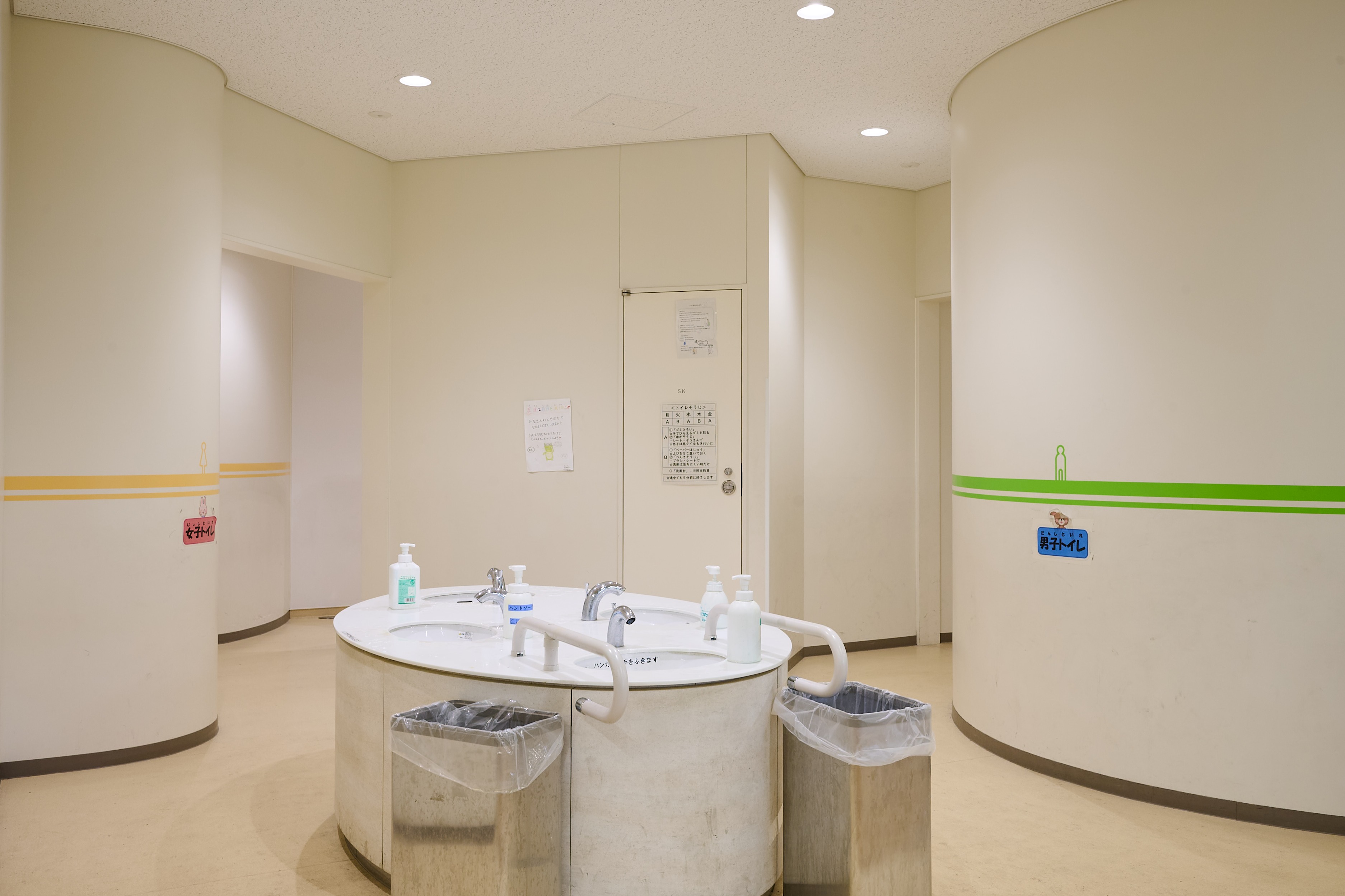 1・2年生のトイレには、小柄な体格の子どもに配慮した小さな便器を採用するなど、成長段階に応じた設計がなされている。また、各階のトイレ入口には、会話を楽しみながら使えるアイランド型の手洗いスペースや、柔らかな曲線を描く内装デザインを取り入れ、子どもたちがトイレに行くことが楽しみになるような空間づくりが行われている。さらに、災害時の避難者や来校する保護者・地域住民など、さまざまな利用者に対応できるよう、各階にバリアフリートイレを設け、誰もが安心して利用できる環境を整備している。