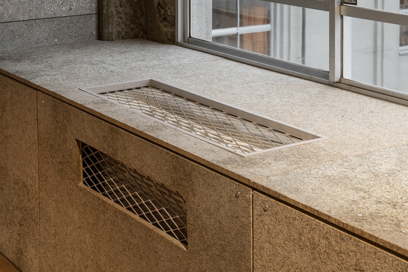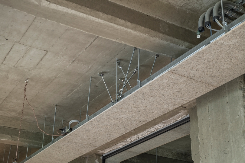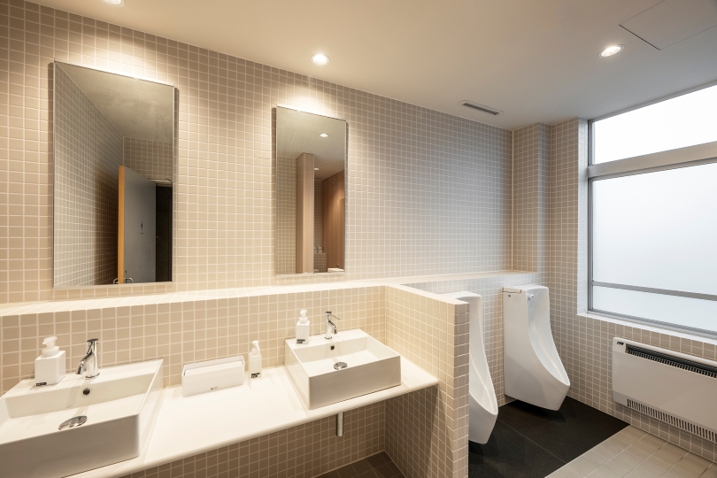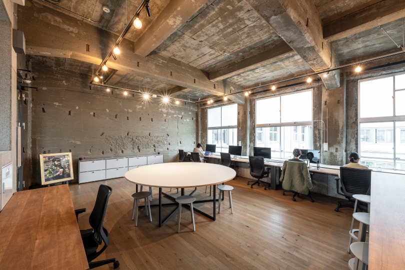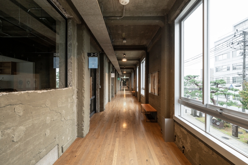 また、天井のコンクリートを塞がずに高さと素材感を生かす方針とし、空調設備は壁際に設置している。ガラス面を多く設けた開放的な構成とすることで、建物内の活動が外から見えるように計画され、テナント間の交流や建物全体の活性化につながっている。
