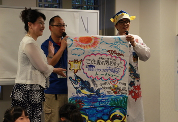 第二部のさかなクンと道田豊先生による「ESD×IOCトークショー」では、IOCの活動や魚を取り巻く海の環境について、実際の写真やイラストを見ながら、わかりやすい説明がありました。人間が海にごみを捨てると、魚がそれを食べて弱ってしまったり、死んでしまったりするという話を例えに、海・川・山などの自然にたくさん触れる機会のある夏休みに、自然環境の素晴らしさや守っていくことの大切さを感じましょう、というお話もしてくれました。また、さかなクンがイラストを描きながら出題するお魚クイズでは、それぞれの魚の特徴を聞きながら、子どもたちが積極的に手を挙げて発言し、ESDについて楽しく学ぶことができました。