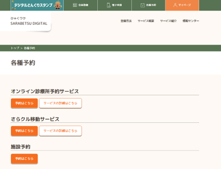 「ひゃくワク SARABETSU DIGITAL」のポータルサイトを通じて、各種サービスや施設利用の予約をオンラインで行える予約システムを導入している。この予約システムは、住民が施設を利用する際に生じやすい予約手続きの煩雑さや、電話や窓口対応による負担を軽減し、誰もがスムーズにサービスを利用できる環境を整えることを目的として整備されたものである。住民はポータルサイト上で各種サービスの予約状況を確認しながら、診療所の受診予約や地域サービス、各種イベントや活動への参加申込みなどをオンラインで行うことが可能となっている。これにより、従来の電話予約や窓口手続きに比べて利便性が向上するとともに、施設利用や地域活動への参加がより容易になっている。