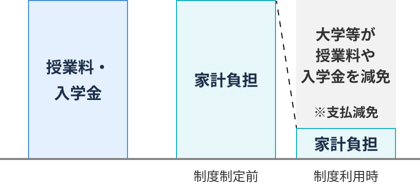 「授業料・入学金の減免」は、学生が大学等に納付する金額が減額・免除されることで、学費負担が減少します。