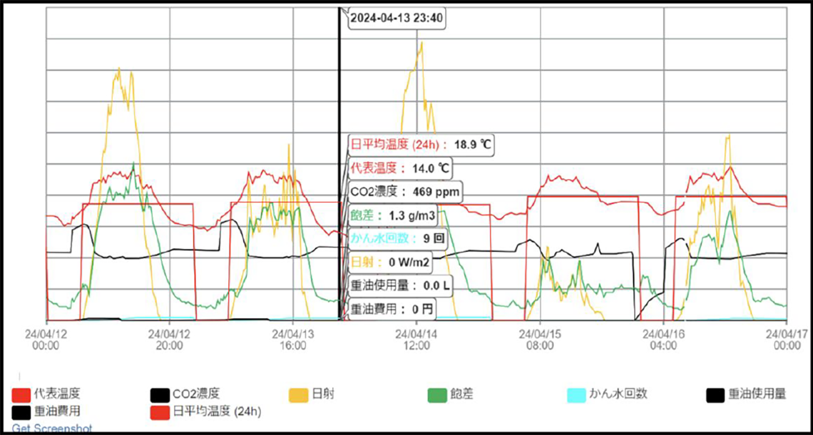 そして、これらのデータを場所や品種ごとに比較検討し、違いが生じた要因を検討します。例えば、同じ日の同じ時刻でも、ハウス内のCO2の濃度や温度、湿度、日射量は異なります。
