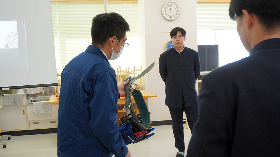 ひと通りVR体験をしたあと、ゴーグルを外し、座学で学んだ知識を復習しました。ポイントは「3点支持」を守ることです。手と足、安全帯の綱の3点を確保すれば高所での作業で落下のリスクを抑えられます。実際の現場では肩や太ももなどを複数のベルトで支えるフルハーネス型の安全帯が使われますので、そのことも解説に加えました。生徒は危険予測の重要性を再認識することができました。最新のデジタル機器に触れながら、授業や実習では不可能な「安全な危険体験」ができたことは貴重な時間だったと思います。