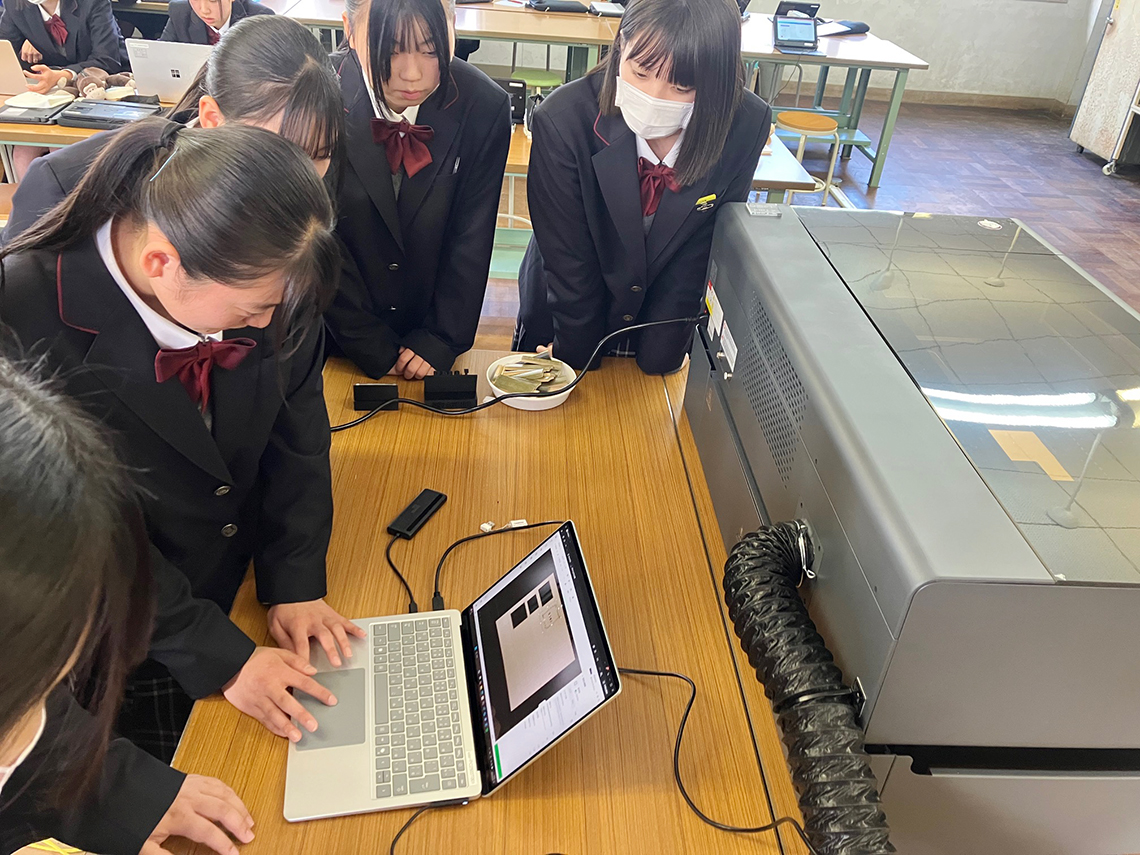 ・DXハイスクール事業による機器が導入されたばかりだが、2月に行われた高校生レストランでは早速、デジタル刺繍ミシンでのぼり旗を、レーザー加工機ではオリジナル箸置きを制作。従来ではできなかったものづくりが可能になった。今後はあらゆる科目での導入機器の活用と授業外での活用ができるように校内研修を実施していく。