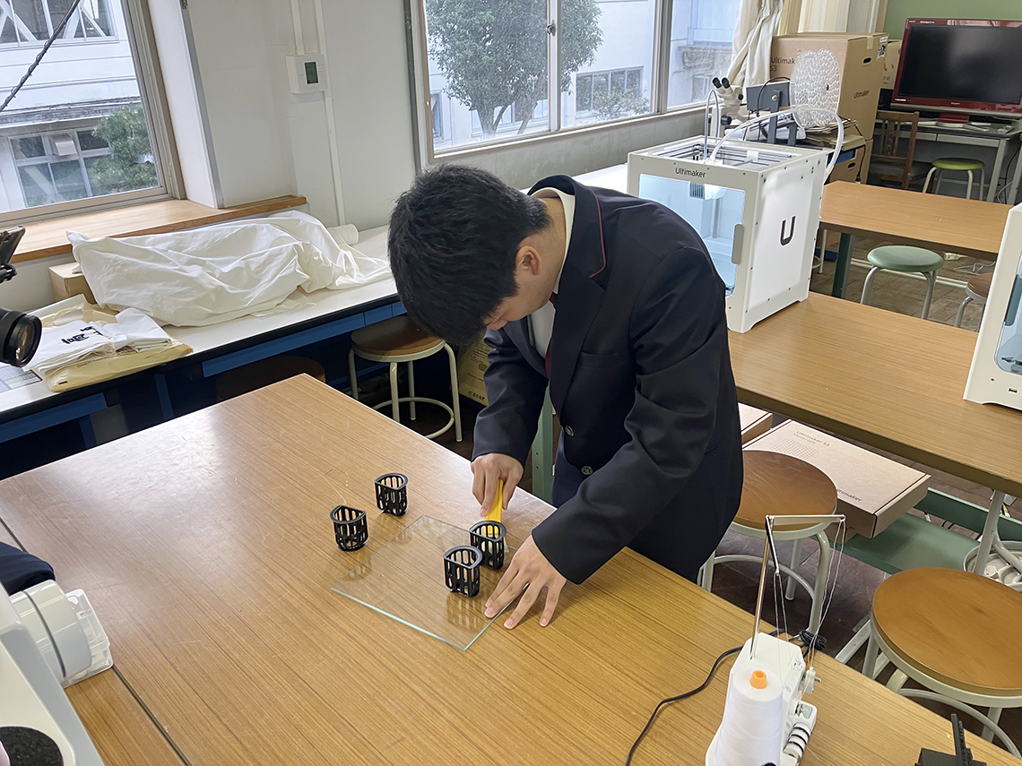 2月に初めてレーザーカッターでネームプレートを製作した際も、生徒は「Canva」で難なくデザインをしていました。多肉植物の鉢は、高性能PCを使い、3Dモデリングソフト「Tinkercad」でデザインして3Dプリンタで出力しました。いずれも無料で利用できるWebアプリです。これまではPC上で作業が終わっていたものが、自分のデザインが実物として具現化されることで、生徒の創造力を刺激するとともにスキルも身につきやすくなります。生徒は、農業だけではなく身近な課題解決に役立つものづくりができることに興味をもって取り組んでいます。