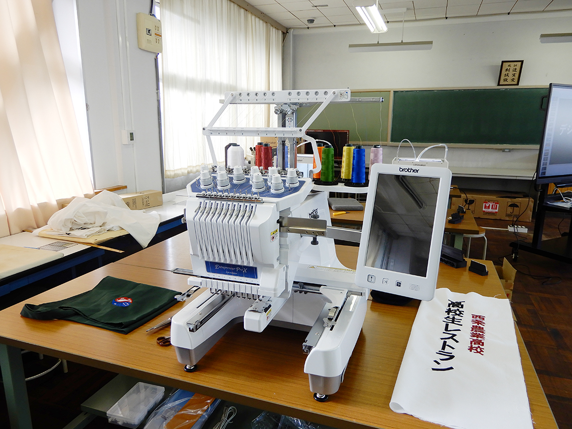 10色の糸をセットできる業務用デジタル刺繍ミシンを整備。高校生レストランののぼりなどを制作。家庭科の教員も活用する予定。