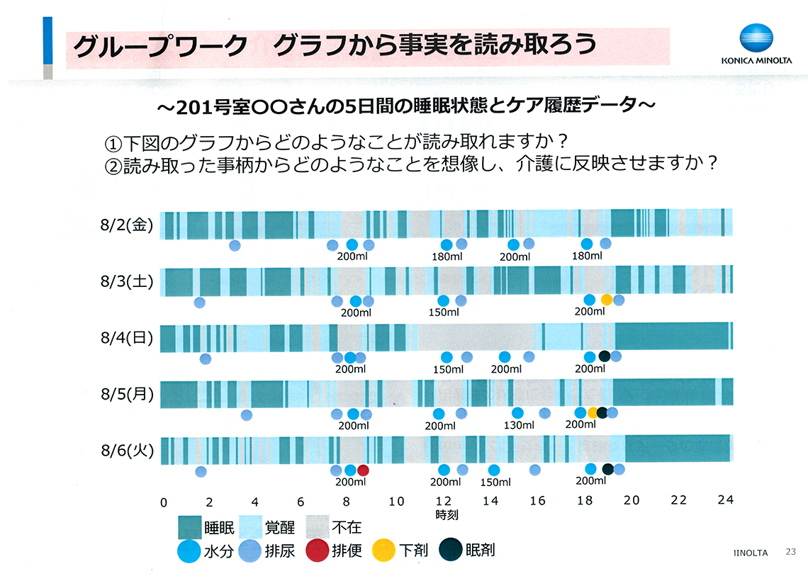 今回使用したHitomeQケアサポートは、利用者の行動やスタッフとのやり取りなどのデータを蓄積することができます。そこで、授業後半のワークショップでは、機器から得られたデータ(利用者の5日間の睡眠状態とケア履歴のグラフ)をどのように読み解いて介護の実践に活かすかについて、グループで話し合いました。