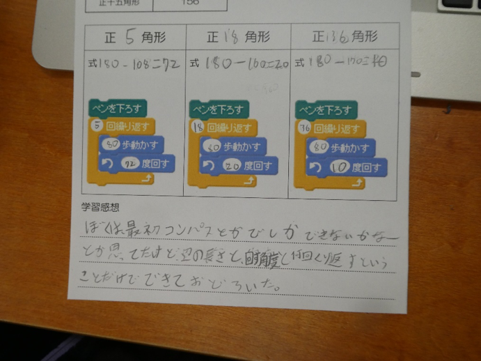 実際,授業の中で子供たちは,外角を見いだし、プログラムを完成させ正多角形をかくことができるようになる。
