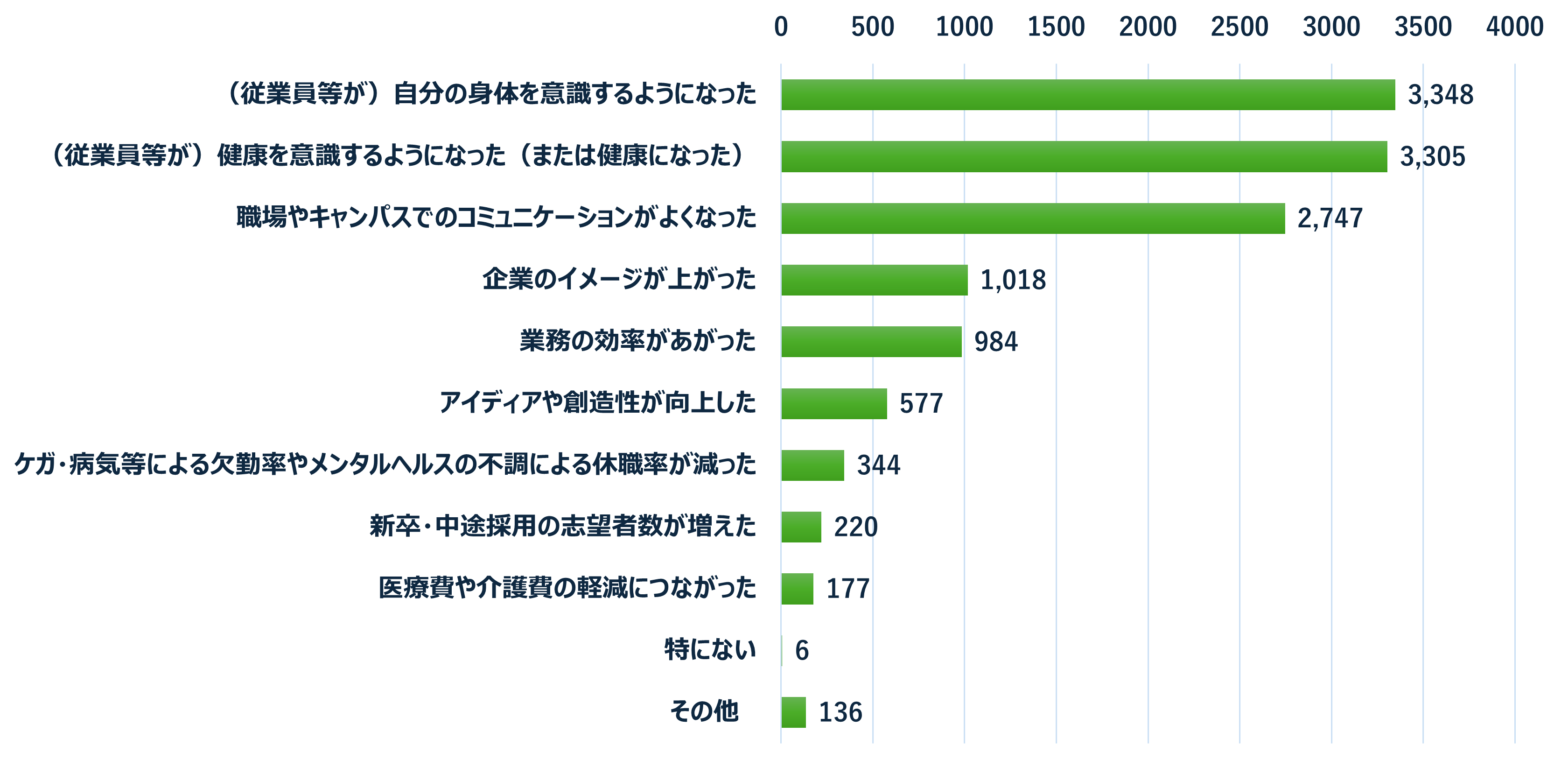 認定1,635団体に対してスポーツエールカンパニーに取り組んだ効果をアンケートしました。多くの団体において「従業員が自分の身体を意識するようになった」「職場のコミュニケーションがよくなった」という回答があり、「休職率が減った」「採用の志望者数が増えた」などの回答もありました。