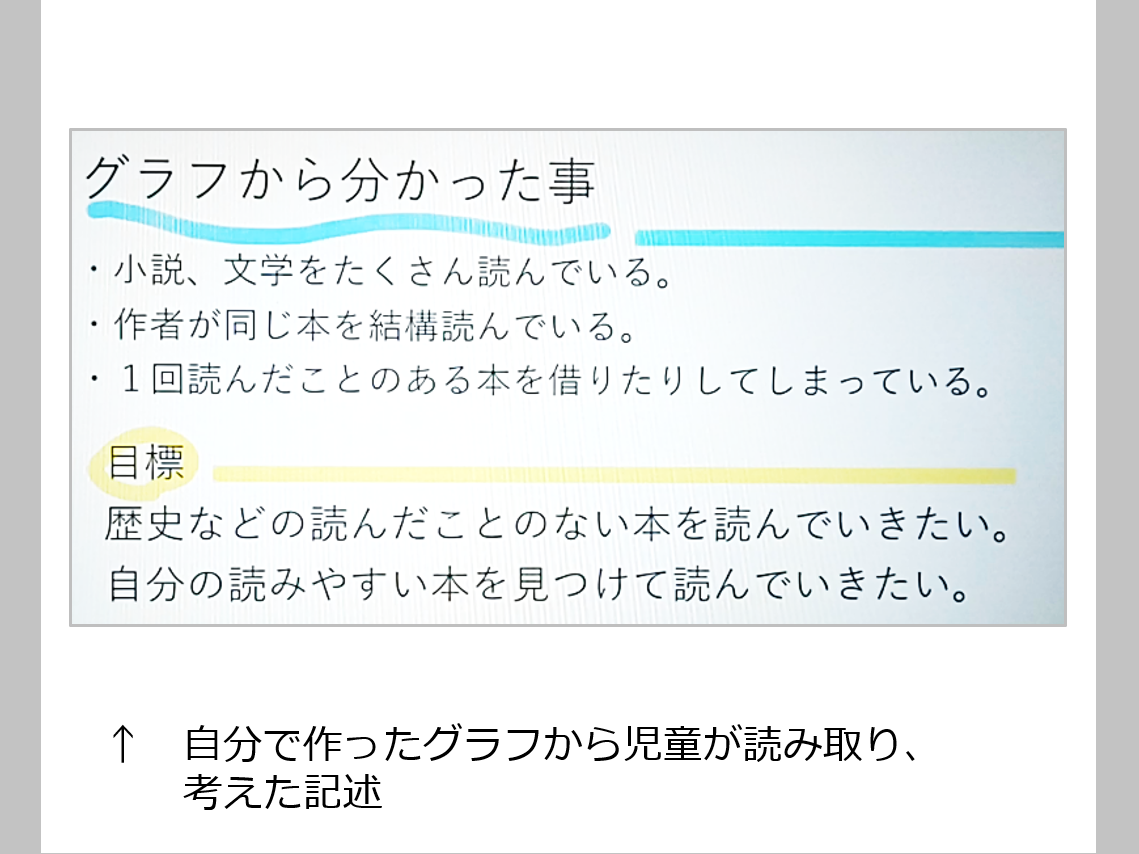 | 活用の概要 | 子供が読書をした時間や内容を記録・保存・整理することにより、自分の読書等の傾向が可視化され、自分自身の活動を振り返ることができるようになった。 情報は表計算ソフトに入力する。表計算ソフトを扱うよさとして、瞬時の計算処理、数値情報の並び替えが容易にできるということが挙げられる。数値を入力することで、合計や平均等を自動的に計算できたりグラフで表したりすることができる。発達段階に合わせて計算式を考えたり、並び替え(昇順・降順)で数値等を整理したりする技能等を身に付けることにもつながった。 整理した情報をクラスメイトと比較したり、過去の自分と比較したりして、子供が自らの読書等を振り返り、今まで読んだことのないジャンルの読書等へつながるよう次の目標設定に生かすことができるようにしている。 |