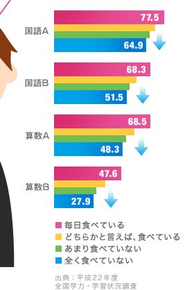 国語A 77.5 国語B 68.3 算数A68.5 算数B47.6 毎日食べている どちらかと言えば、食べている あまり食べていない 全く食べていない出典:平成22年度 全国学力・学習状況調査